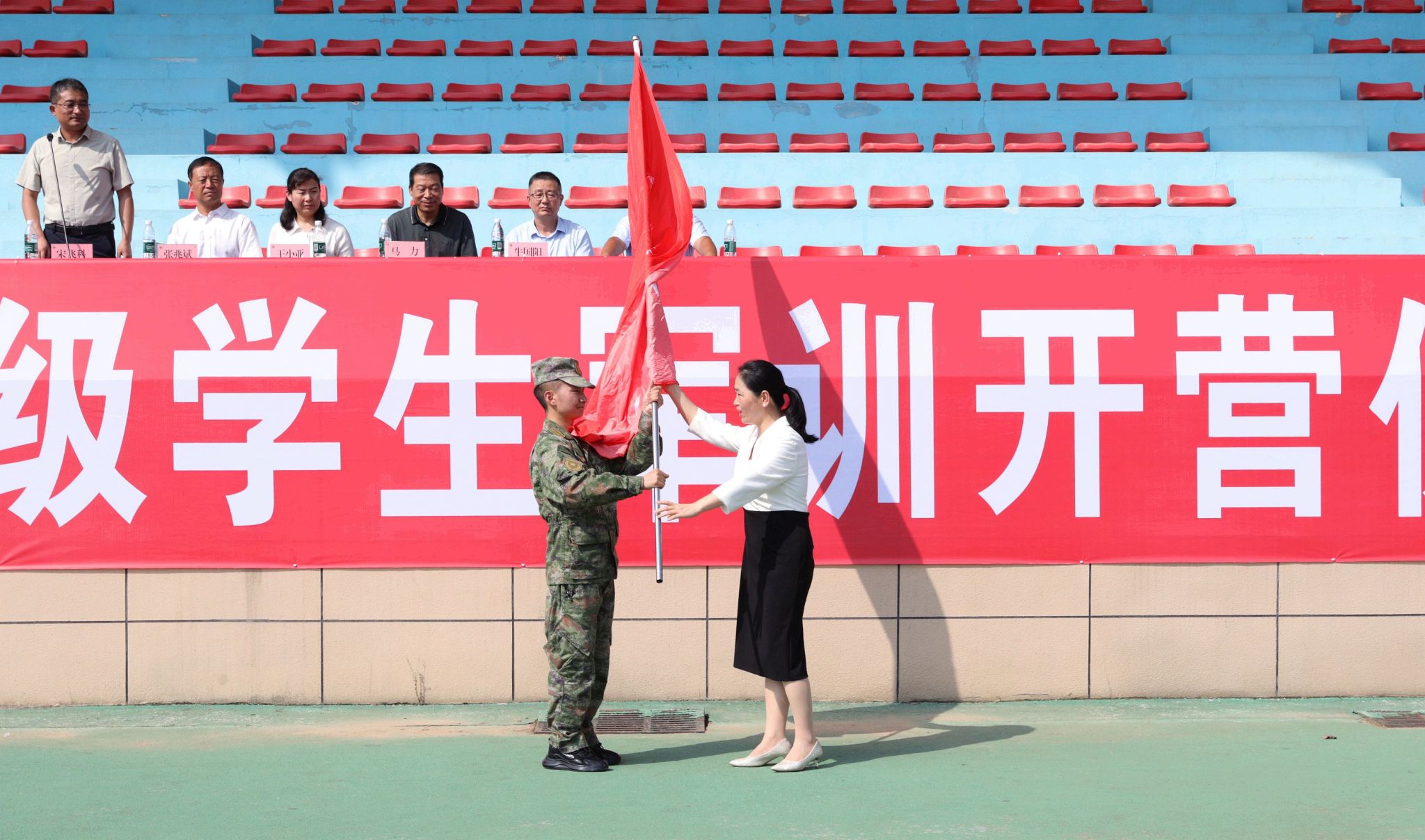 吴旭锦向军训团授团旗,宣布米博app2025级新生军训正式开始。