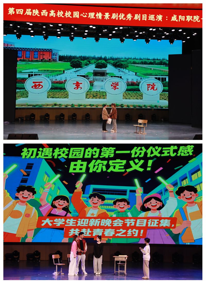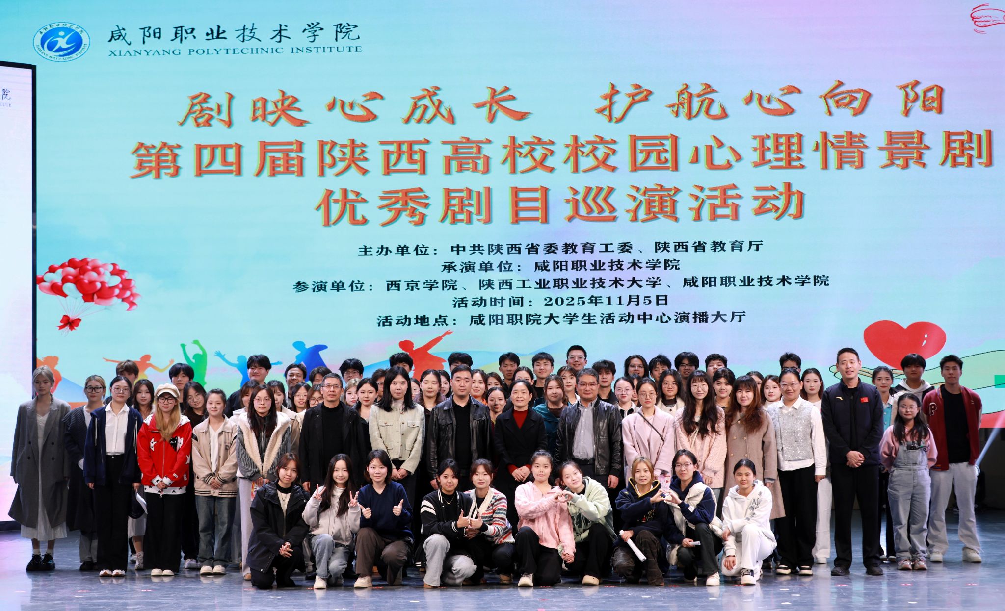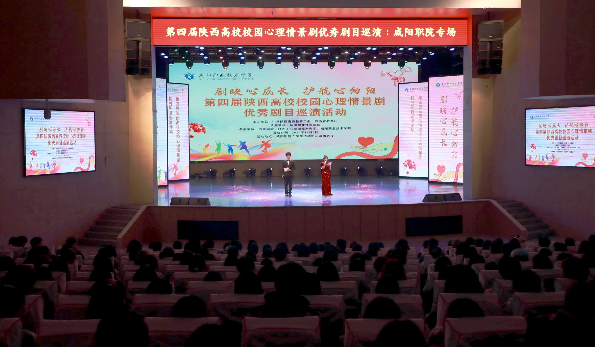咸阳职院副院长吴旭锦、学生处负责人,陕西中医药大学、西京学院、陕西国际商贸学院、陕西服装工程学院、陕西工业职业技术大学、陕西能源职业技术学院等兄弟院校的师生代表,以及各二级学院学发办主任、心理辅导员、2025 级学生代表等500余人观看,一起分享这场心灵与艺术的盛宴。