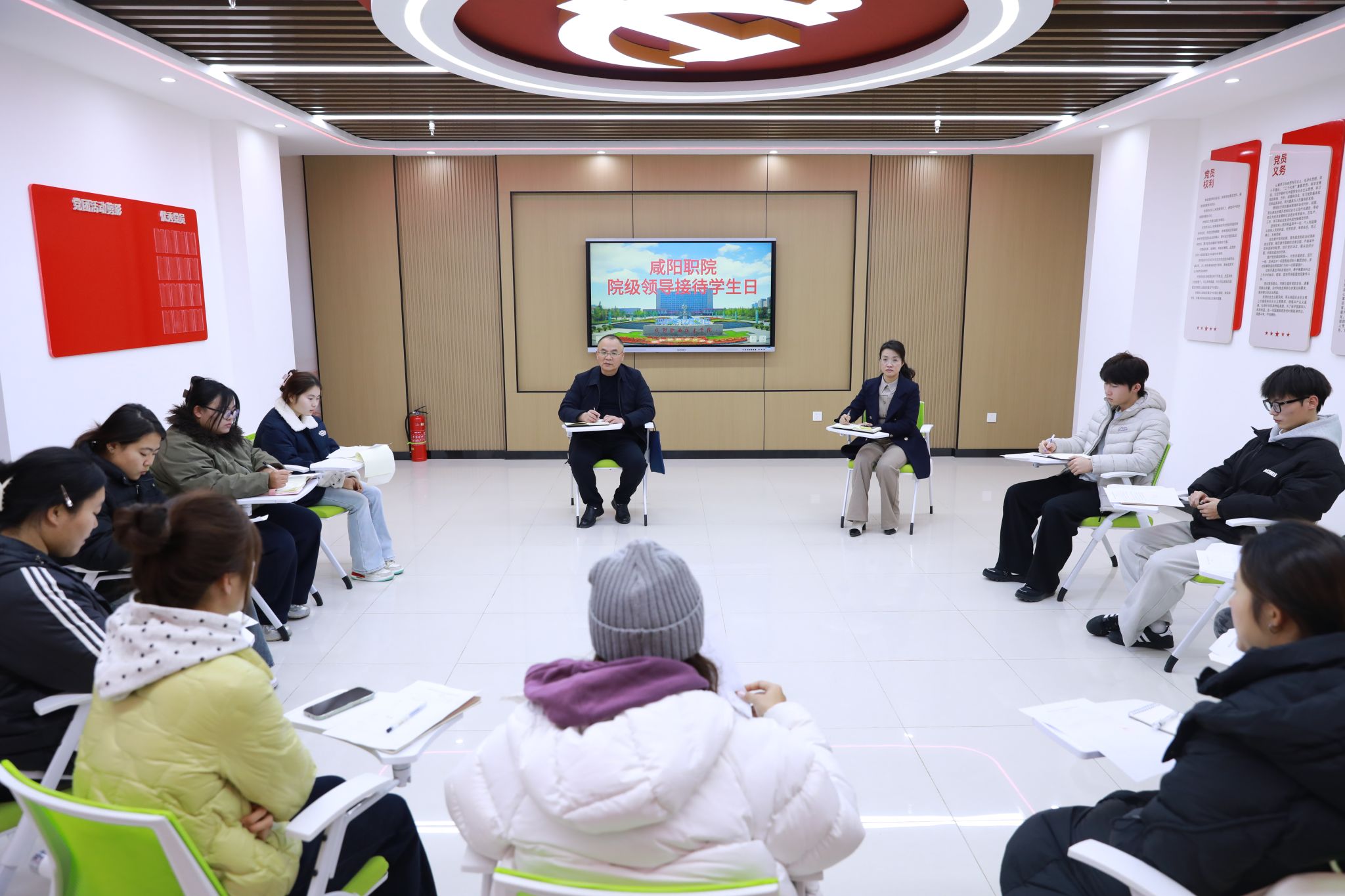 为精准把握在校学生情况,切实解决同学们的急难愁盼问题,12月23日,咸阳职院副院长杨新宇在“一站式”学生社区学生党团活动中心与来自11个二级学院的学生代表面对面座谈,倾听学生心声。教务处负责人参加活动。