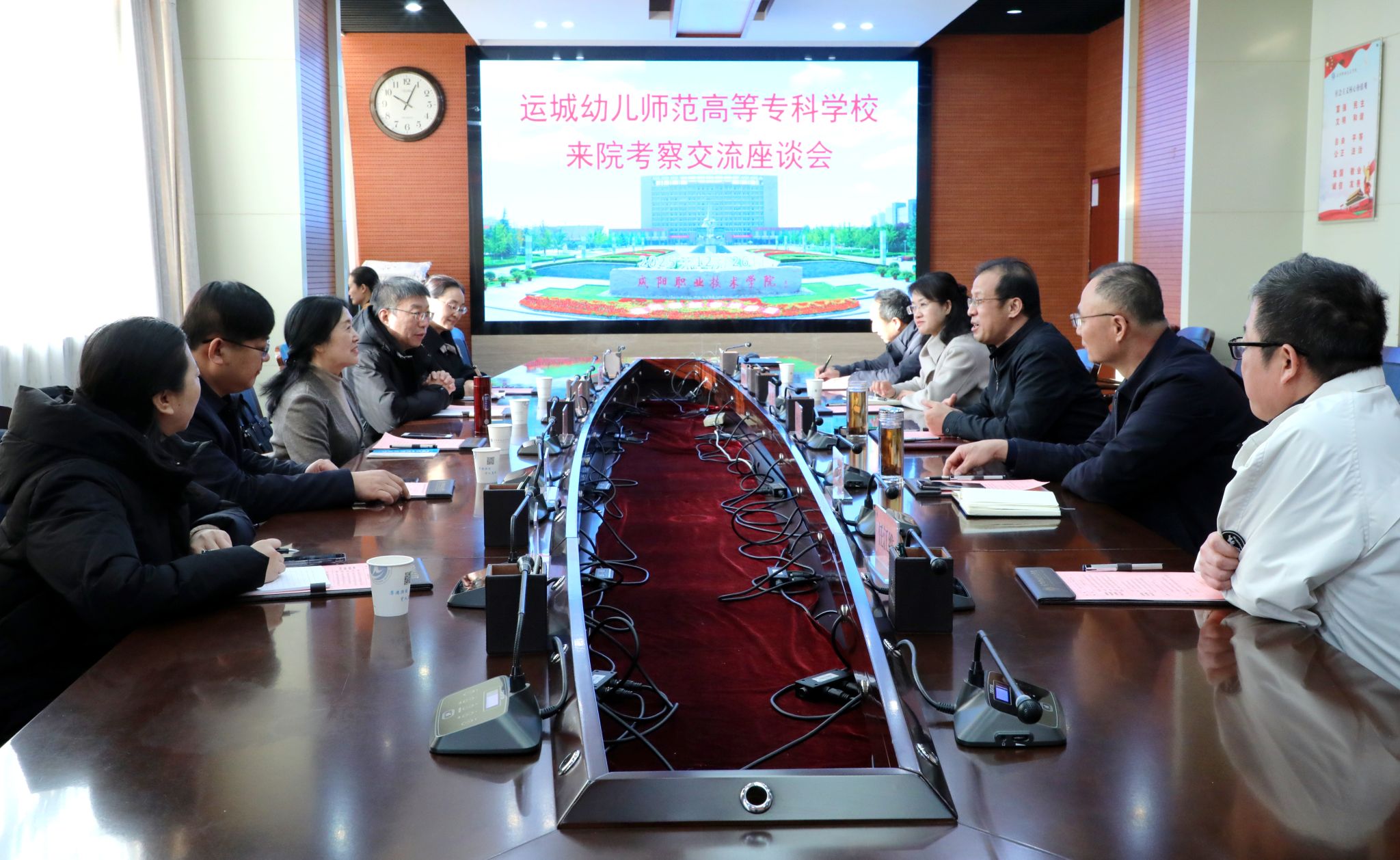 座谈会上首先观看了学院宣传片,侯娟珍校长介绍了运城幼儿师范高等专科学校基本情况。杨卫军从办学理念、专业建设、教育教学成果、课程建设、专业建设、社会服务、产教融合等方面介绍了咸阳职院的特色经验。双方还就学前教育专业、师资培训等进行了对口交流,并表示两校将进一步加强沟通与协作,共同推动幼儿师范教育事业蓬勃发展。