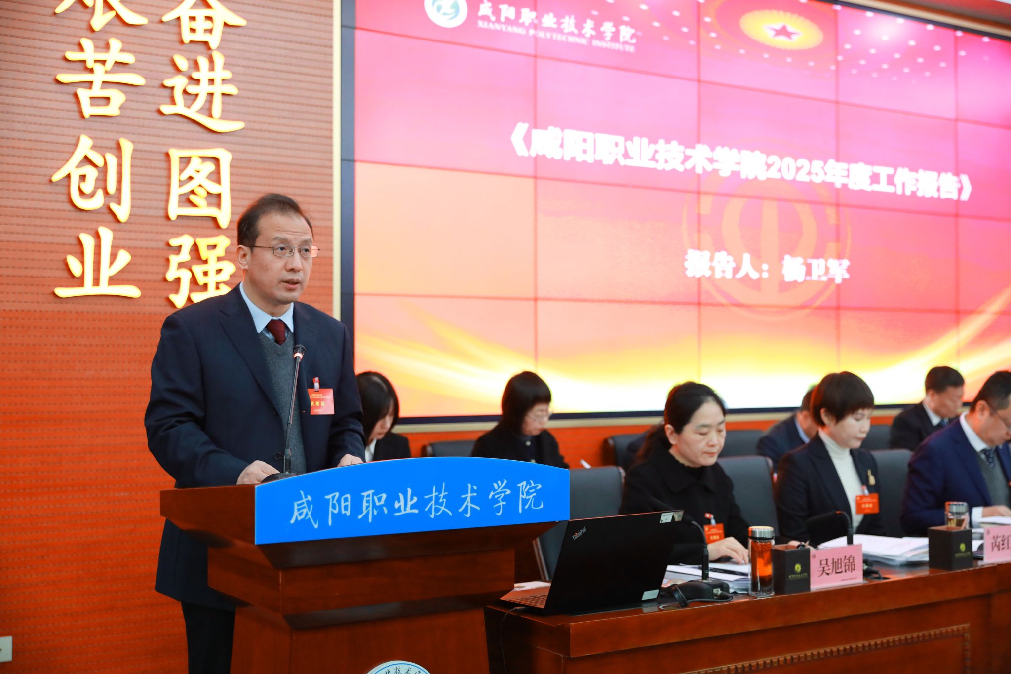踔厉奋发“十五五”,凝心聚力启新局。1月27日,咸阳职院第三届教职工代表大会暨工会会员代表大会(以下简称“双代会”)召开。学院领导张迪、杨卫军、孙彦彬、赵维、芮红亚、杨新宇、吴旭锦、王宇文出席会议。党委书记张迪讲话,院长杨卫军作学院工作报告,党委副书记孙彦彬主持会议。125名代表齐聚一堂,共商学院发展大计,共绘高质量发展新蓝图。