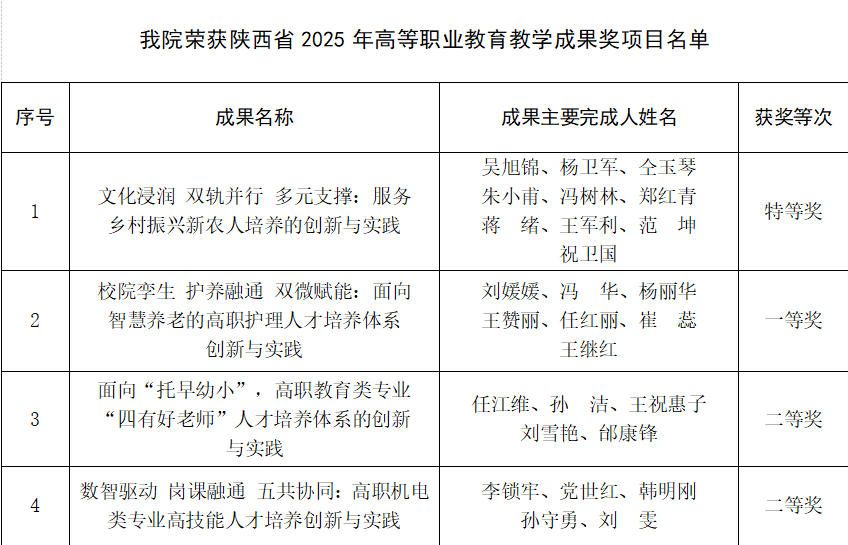近日,陕西省人民政府办公厅发布了《关于表彰2025年高等教育教学成果奖获奖项目的通报》(陕政办函〔2026〕40号),咸阳职院获特等奖1项,一等奖1项,二等奖2项,获奖数量、等级和质量均位居省内高职院校前列,充分彰显了学院在深化教育教学改革、提升人才培养质量、推进高等职业教育高质量发展方面的成效。
